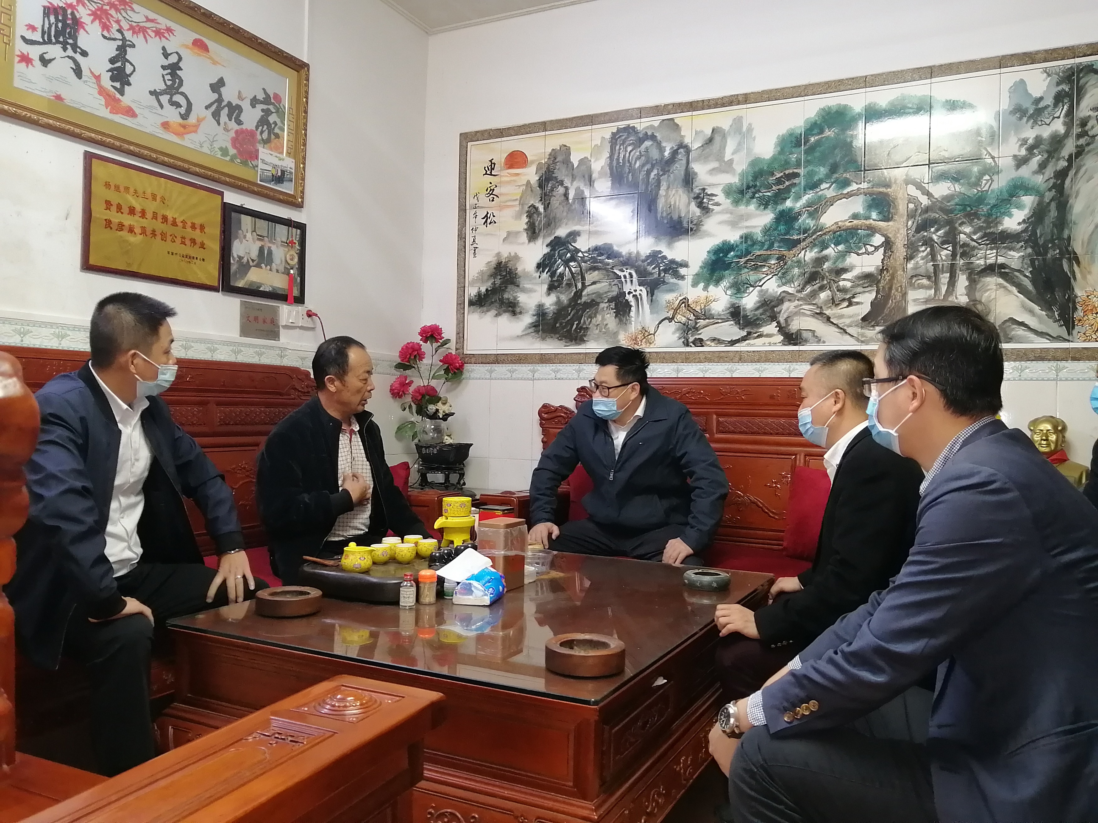 鐘勁東(左三)慰問(wèn)大池農(nóng)場(chǎng)公司職工楊繼順(左二)