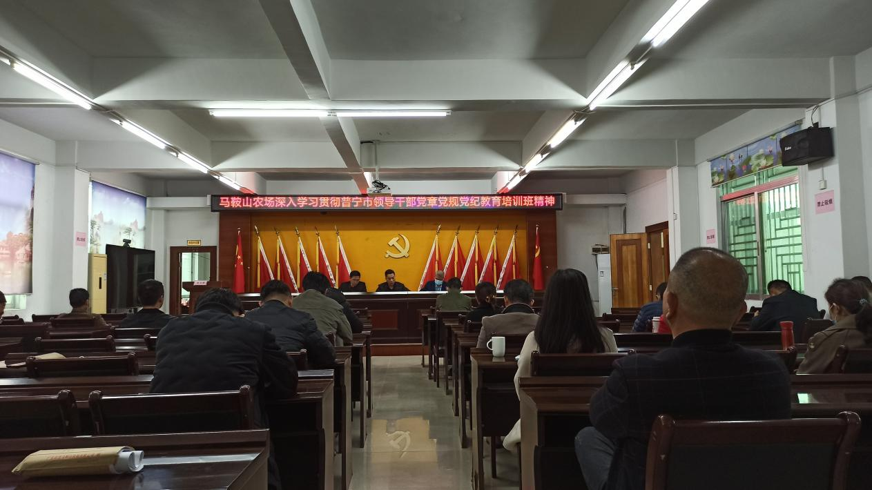 12月20日下午,馬鞍山農(nóng)場召開深入學(xué)習(xí)貫徹普寧市領(lǐng)導(dǎo)干部黨章黨規(guī)黨紀(jì)教育培訓(xùn)班精神會議。農(nóng)場機關(guān)全體干部,各村(居)管區(qū)書記參加了會議。會議由黨委書記黃七星主持。